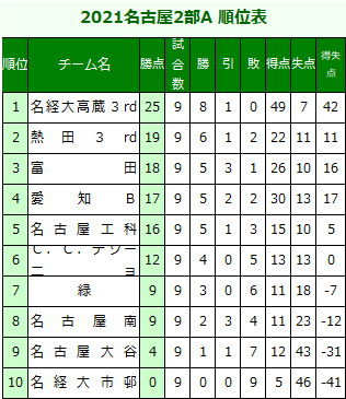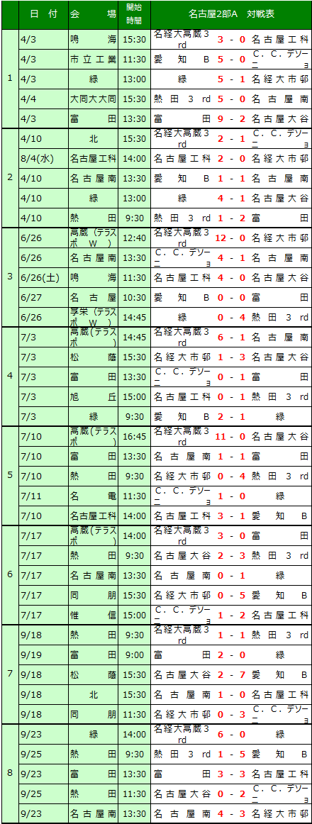 愛知県高校サッカー名古屋地区リーグの結果を送信ください。