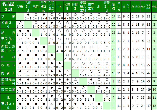 愛知県高校サッカー名古屋地区リーグの結果を送信ください。