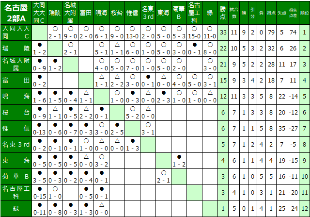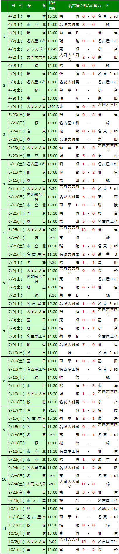 愛知県高校サッカー名古屋地区リーグの結果を送信ください。