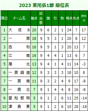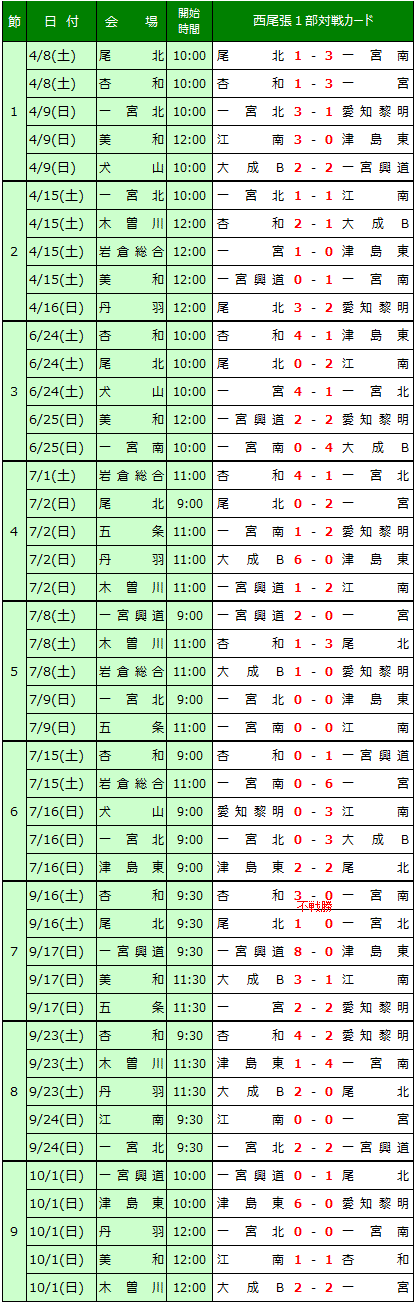 愛知県高校サッカー西尾張地区リーグの結果を送信ください。