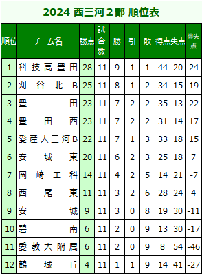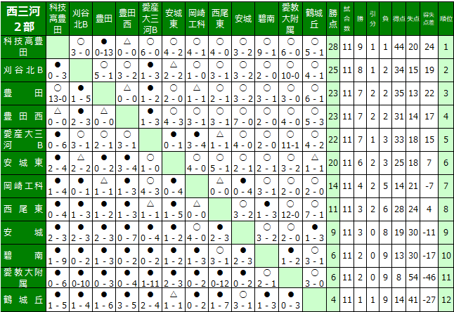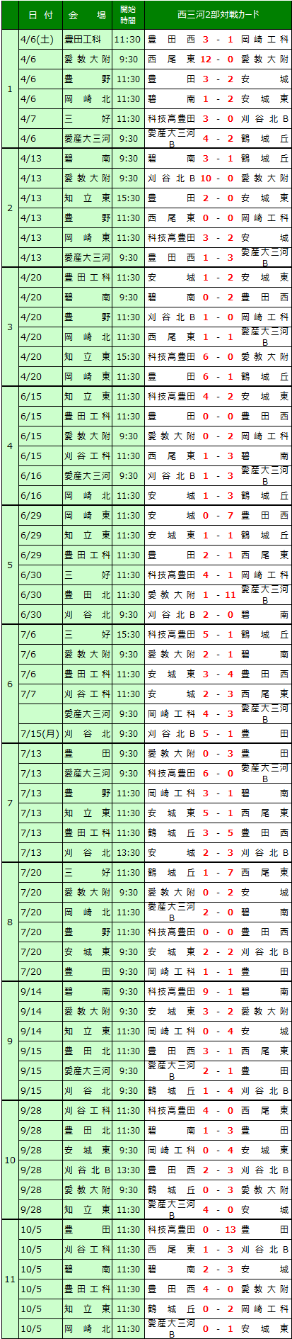 愛知県高校サッカー西三河地区リーグの結果を送信ください。