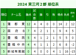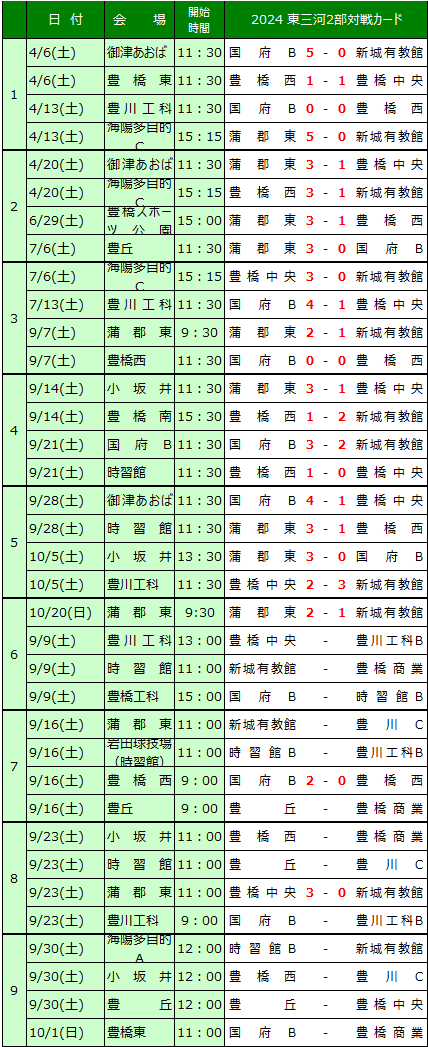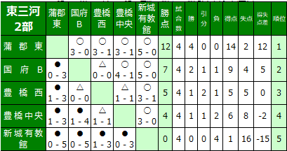愛知県高校サッカー東三河地区リーグの結果を送信ください。