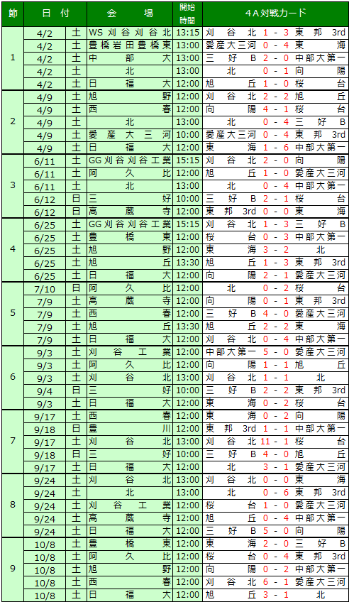愛知県高校サッカー4部Aリーグの結果を送信ください。 記入例 富士山 3-3 琵琶湖 ◇