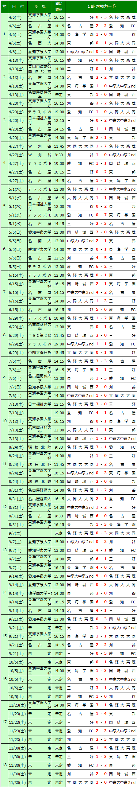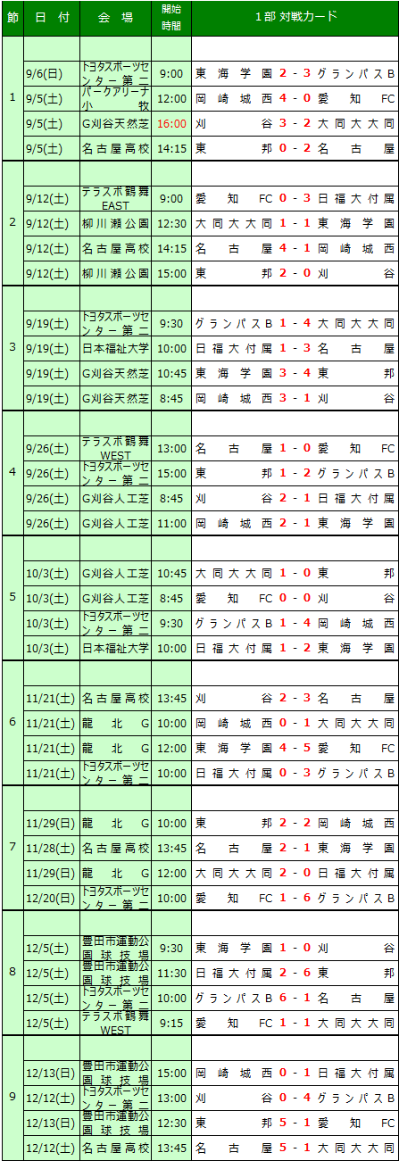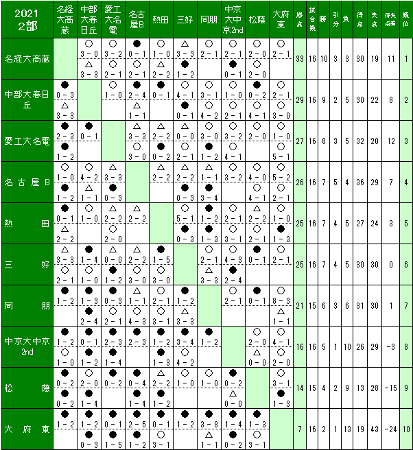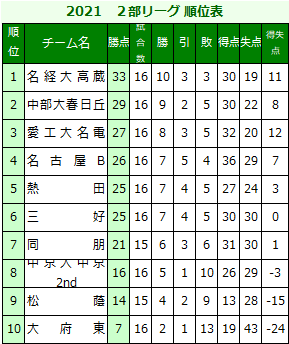 | (2)下位2チームは、次年度県2部リーグに降格する。 (3)その他のチームは、次年度県1部リーグに残留する。 |