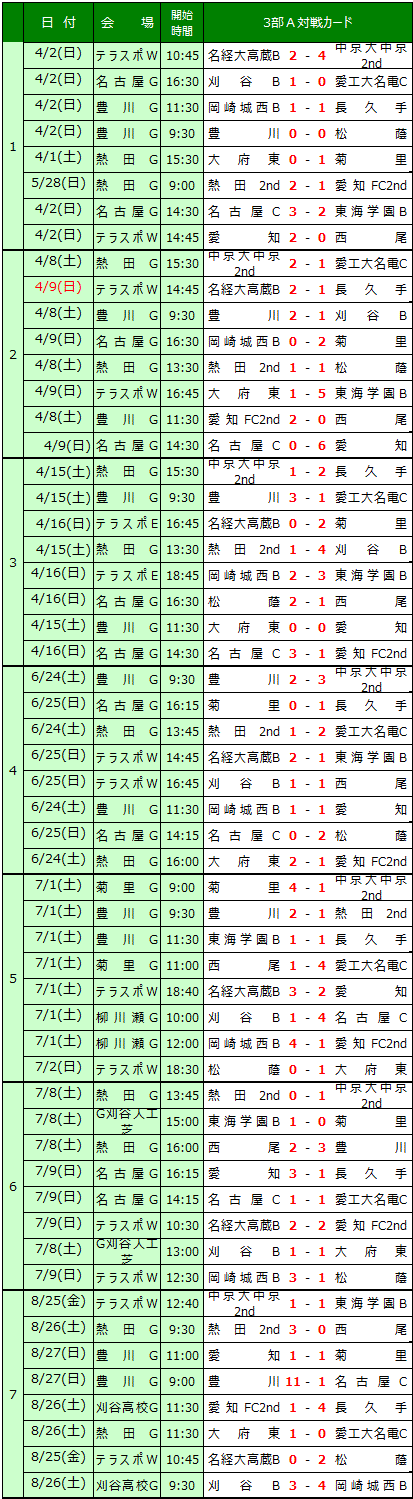 愛知県高校サッカーリーグの結果を送信ください。