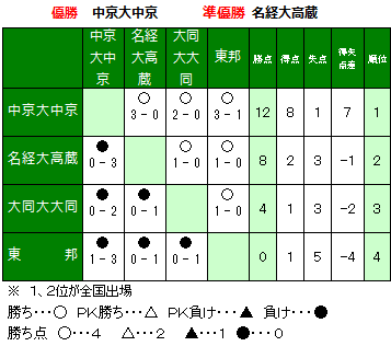 80分で同点の場合は即PK戦を行う。決勝リーグの順位決定は、勝ち4点、PK勝ち2点、PK負