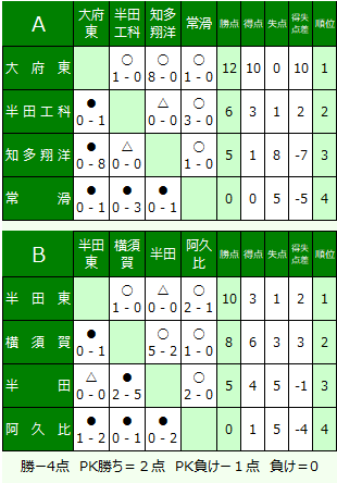 80分で同点の場合は即PK戦を行う。決勝リーグの順位決定は、勝ち4点、PK勝ち2点、PK負