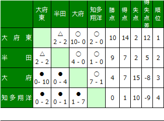 け1点、負け0点の勝ち点制とする。ただし、勝ち点が同じ場合は、得失点差、総得点、当該チーム